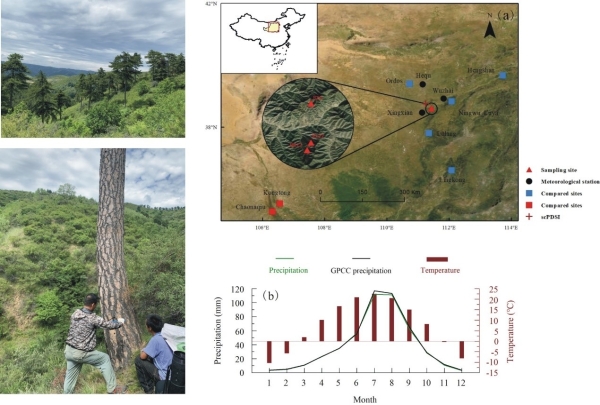 中国科学院地球环境研究所树木年轮研究课题组利用采自吕梁山中北部多地树轮宽度资料,重建了研究区1773-2020年上年8月到当年7月(水文年)的降水量变化历史。在过去近250年中,1910-1932年和1796-1806年分别为研究区最干旱和最湿润的时期;在十年尺度上,1920s和2010s分别为最干旱和最湿润的十年;在百年尺度上,19世纪相对湿润,而20世纪相对干旱。尽管20世纪下半叶研究区呈现明显的降水减少趋势,但这一趋势已在2000s初期得到扭转,近十几年研究区逐渐变湿,2014-2020年是过去250年中的第二个最湿润时期。根据变化周期来看,未来几年降水可能会持续增加;统计发现,黄土高原干旱更易发生在高温时期。