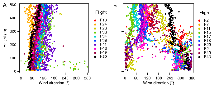 区别于毗邻森林地区,在河风作用下,河流上空VOC亦呈特征性垂直分布。大涡模拟结果表明,河风期间,VOC浓度最大值出现在河流上空200-500 m(图3)。这与无人机观测结果一致(图2,500 m处VOC的浓度比100 m处的浓度可高出80%),也与在该观测点500 m高空的飞机飞行航测数据分析一致(详见论文第3.1部分)。