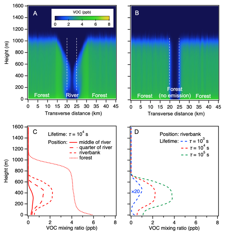 森林排放的挥发性有机化合物(VOC)是连接生物圈和大气圈的重要物种,对森林生态系统生物信号传递、空气质量、以及区域和全球气候有着不容忽视的作用。本研究以无人机化学传感为特色,通过使用无人机搭载化学、气象传感采样系统收集亚马逊内格罗河上空大气VOC和气象数据,结合大涡模拟,探讨了河陆风对典型亚马逊流域河滨生态区生物源VOC传输和扩散的影响。