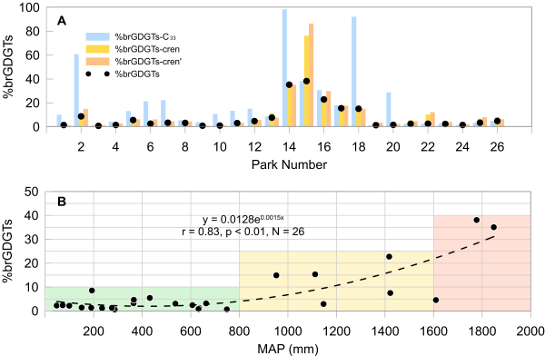 图1 A.利用多种生物标志物定量示踪土壤输入对公园湖泊brGDGTs贡献的上限;B.土壤brGDGTs输入上限与年均降水量的关系。