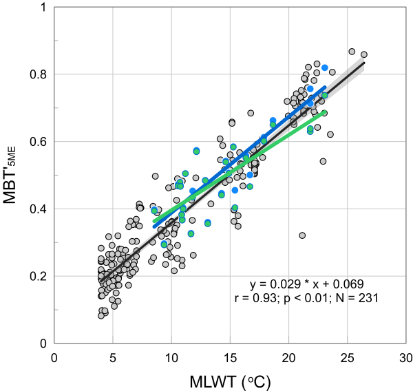 图2 纯湖相brGDGTs端元(蓝线和绿线之间)和全球淡水湖(灰点)MBT’5ME与温度的关系对比。