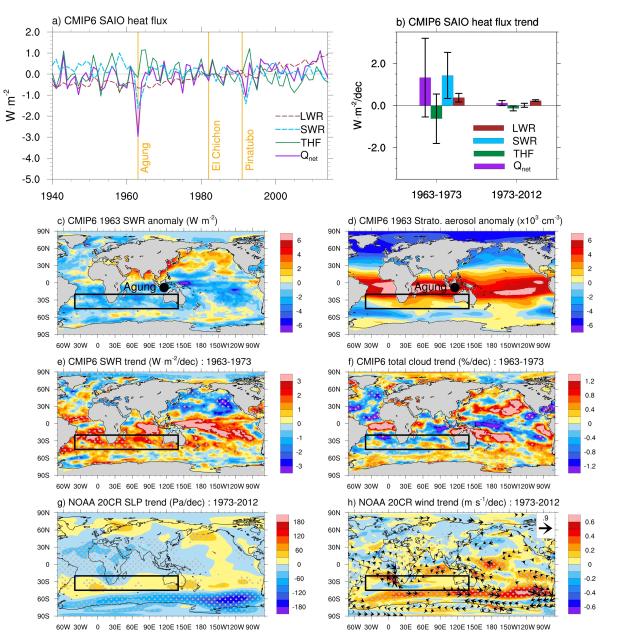 图2(a)SAIO平均表面热通量的时间序列(LWR为长波辐射,SWR为短波辐射,THF为湍流热通量,Qnet为总热通量)。黄色竖线表示火山事件。(b)总热通量及其分量在1963-1973年和1973-2012年期间的线性变化趋势。(c-d)1963年SWR和平流层气溶胶异常。(d-f)1963-1973年SWR和总云量的线性变化趋势。(g-h)1973-2012年海平面气压(SLP)和风的线性变化趋势