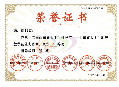 近日,新葡的京官网推荐的3名学科教学(地理)专业研究生在第十二届山东省大学生科技节——山东省大学生地理教学大赛决赛中取得优异成绩,荣获一等奖1项、二等奖2项、三等奖6项;4位老师获“优秀指导教师”荣誉称号。